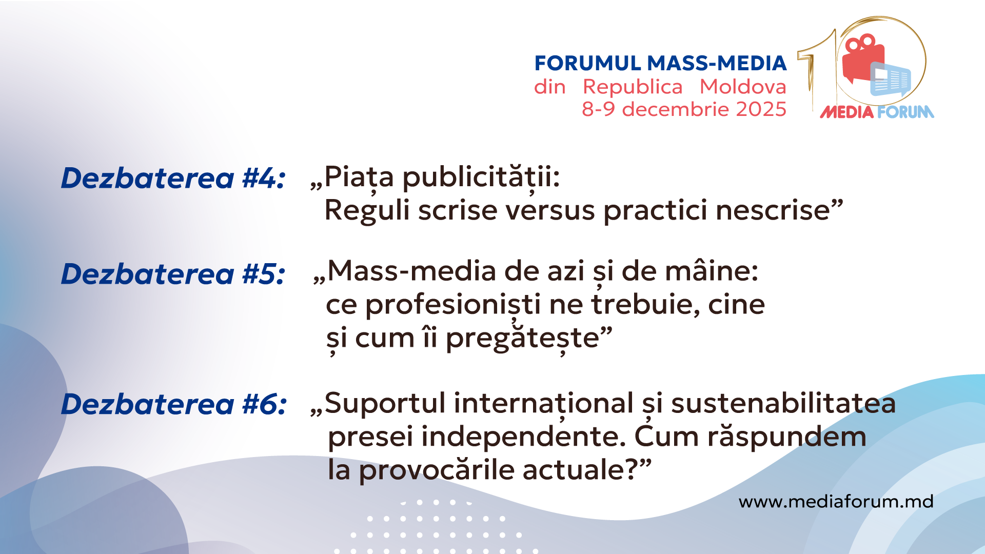 In addition to topics related to media legislation and information resilience, participants in the 10th edition of the Media Forum, which will take place on December 8 and 9, 2025, in Chisinau, will also discuss the economic challenges facing the industry: the state of the advertising market, training for editorial staff, and international support for the sustainability of independent media.