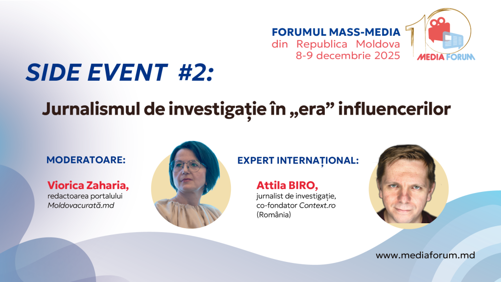 The second special event of the Forum will launch the “BLACK BOOK of public money waste in the Republic of Moldova,” now in its seventh annual edition. The BLACK BOOK is a collection of well-documented journalistic investigations into cases of public procurement in violation of legal norms and in situations of conflict of interest, infrastructure projects in which investments were made inefficiently, or fraudulent management of European investments. The same event will feature a discussion on investigative journalism in the “era” of influencers with Romanian journalist Attila Biro, co-founder of the Context.ro portal, moderated by Viorica Zaharia, editor of the Moldovacurată.md portal. Attila Biro has over 20 years of experience in investigating organized crime and corruption, including international projects, alongside other journalists who are members of the Organized Crime and Reporting Project network. He has collaborated on high-profile journalistic investigations, such as The Laundromat in Azerbaijan and The Panama Papers.