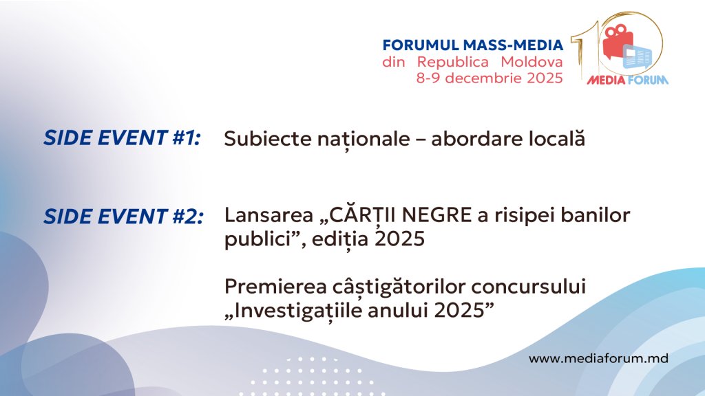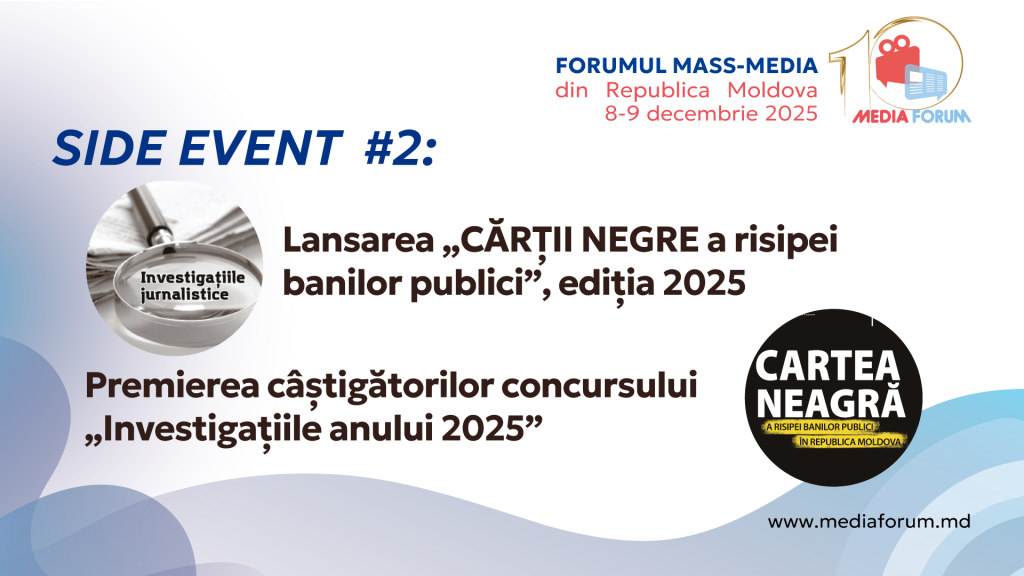 The Media Forum 2025, which will take place on December 8 and 9 in Chisinau, will also feature two special events: one dedicated to the local press and the other to investigative journalism. As is tradition, a new edition of the “BLACK BOOK of public money waste in the Republic of Moldova” will be launched and the best investigative journalism of the year will be awarded.