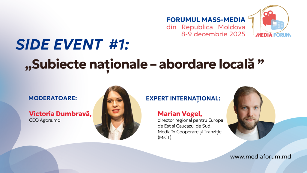 The event “National Issues – Local Approach,” hosted by the Berlin-based organization Media in Cooperation and Transition (MiCT), will discuss the causes of the decline of regional/local media and the lack of credible sources of information in the territory capable of reflecting local issues in an objective and balanced manner. The moderator of the event, Victoria Dumbravă, director of the Agora.md portal, will also address possible solutions to this problem, such as the joint mobilization of media professionals, other content creators, public authorities, and development partners to support the consolidation of credible local media, which is very important for communities and for protecting the information space from disinformation. Marian Vogel, MiCT Regional Director for Eastern Europe and the South Caucasus, will participate as an international expert. Marian has extensive experience in data and communication and has implemented data-driven election campaigns at the local and national levels in Germany, Italy, and Austria. He currently coordinates emergency support programs for journalists and media institutions, thus supporting media ecosystems in difficult and high-risk conditions.