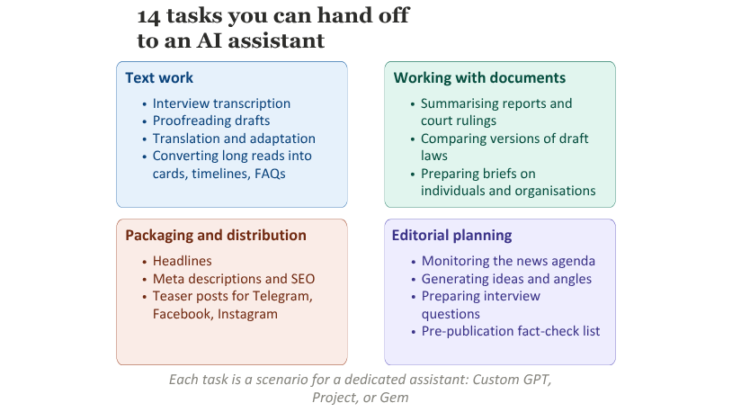 Any newsroom can now assemble an entire team of virtual assistants: one to process interviews, another to summarise documents, a third to adapt stories for social platforms. But just like a real team, the quality of the output depends on the quality of the brief. A capable assistant with a vague brief will still produce mediocre work.