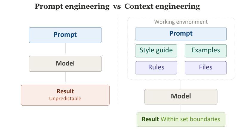 The difference is straightforward. Prompt engineering is knowing how to ask an expert the right question. Context engineering is preparing a briefing folder for that expert before the meeting — complete with documents, references, guidelines, and examples. One approach relies on a clever question. The other designs an environment where the model is far more likely to deliver what you actually need.